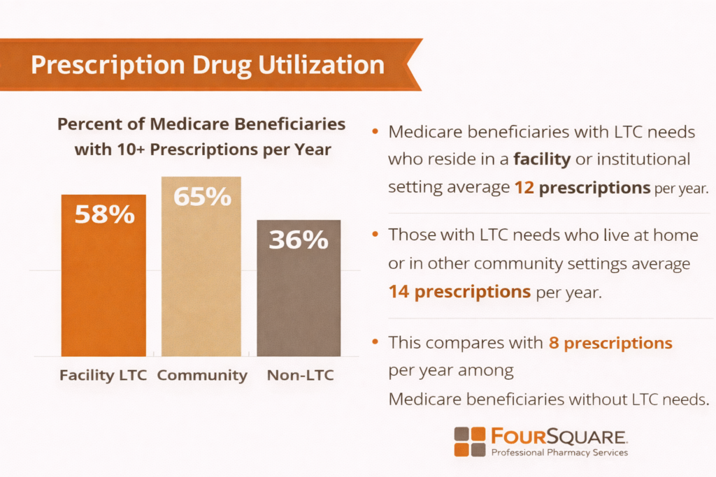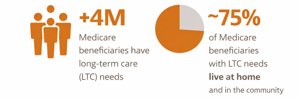More than four million Medicare beneficiaries suffer from multiple chronic health conditions and need long-term care services (LTC). Most – 75% – live at home, while only 25% live in long-term care (LTC) facilities like nursing homes and assisted living facilities. (Coalition, 2026)